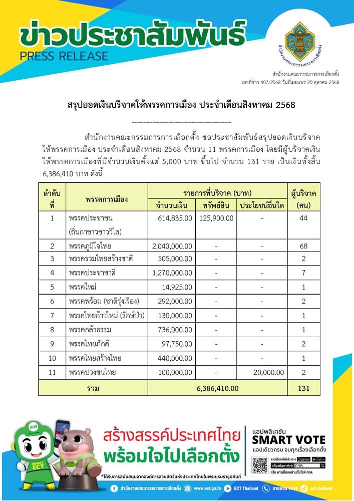 เมื่อวันที่ 20 ตุลาคม 2568 สำนักงานคณะกรรมการการเลือกตั้ง (กกต.) ได้เผยแพร่ประชาสัมพันธ์ ผลสรุปยอดเงินบริจาคให้พรรคการเมือง ประจำเดือนสิงหาคม 2568 จำนวน 11 พรรคการเมือง โดยมีผู้บริจาคเงินให้พรรคการเมืองที่มีจำนวนเงินตั้งแต่ 5,000 บาท ขึ้นไป จำนวน 131 ราย เป็นเงินทั้งสิ้น 6,386,410 บาท ดังนี้ โดยพรรคการเมืองที่มียอดได้รับบริจาค มากเป็นอันดับ 1 ได้แก่ พรรคภูมิใจไทย จำนวนเงิน 2,040,000.00 บาท จากผู้บริจาคจำนวน 68 คน