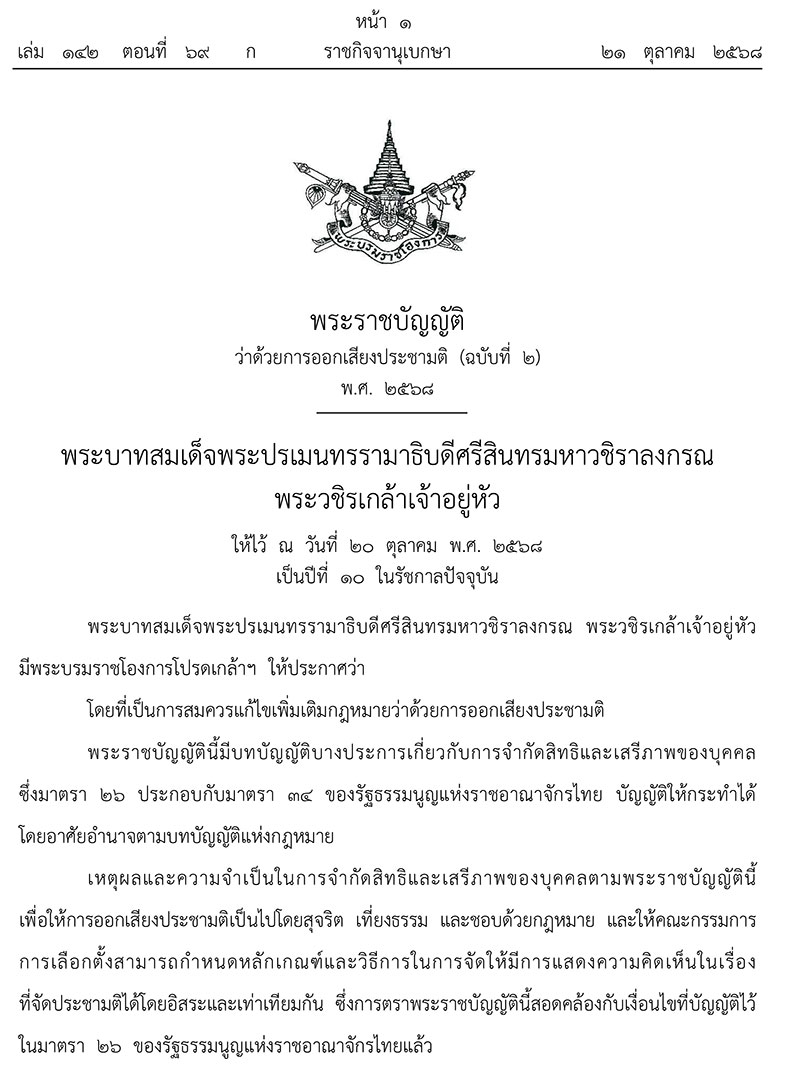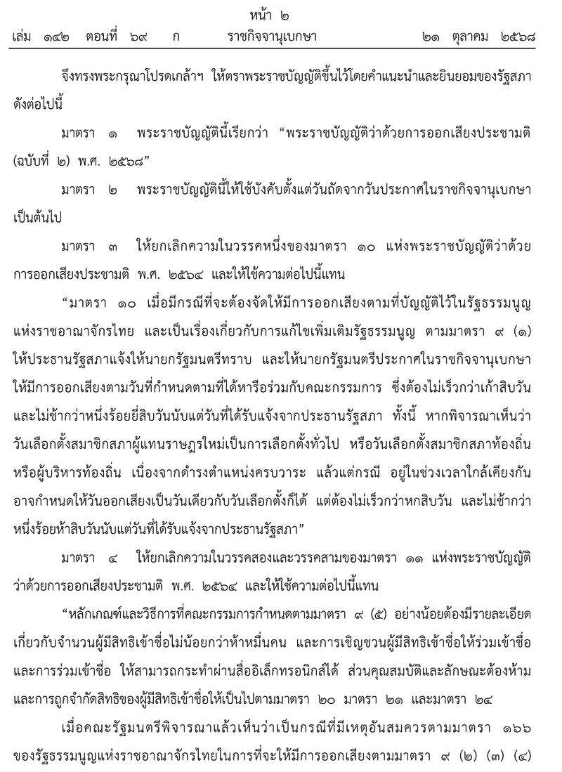 วันที่ 21 ตุลาคม 2568 ผู้สื่อข่าวรายงานว่า เว็บไซต์ราชกิจจานุเบกษา ลงประกาศเมื่อวันที่ 21 ต.ค. ต่อพระราชบัญญัติ (พ.ร.บ.) ว่าด้วยการออกเสียงประชามติ (ฉบับที่2) พ.ศ.2568 แล้ว ซึ่งจะมีผลบังคับใช้ในวันถัดไปหลังจากที่ประกาศในราชกิจจานุเบกษา