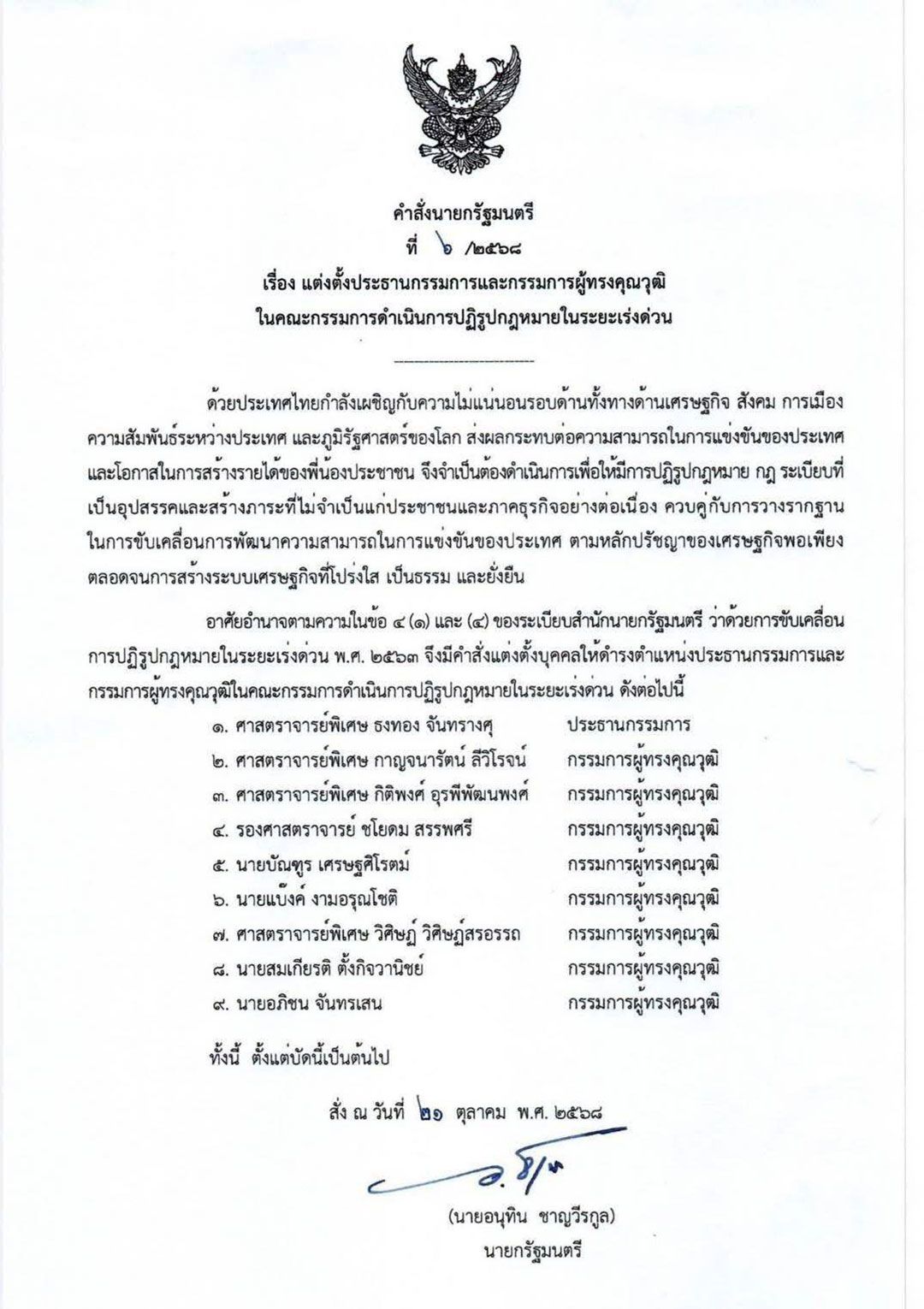 เมื่อวันที่ 21 ตุลาคม 2568 ผู้สื่อข่าวรายงานว่า นายอนุทิน ชาญวีรกูล นายกรัฐมนตรี และรมว.มหาดไทย ลงนามคำสั่งนายกรัฐมนตรี ที่ 1/2568 เรื่อง แต่งตั้งประธานกรรมการและกรรมการผู้ทรงคุณวุฒิ ในคณะกรรมการดำเนินการปฏิรูปกฎหมายในระยะเร่งด่วน โดยมีข้อความระบุว่า ด้วยประเทศไทยกำลังเผชิญกับความไม่แน่นอนรอบด้านทั้งทางด้านเศรษฐกิจ สังคม การเมือง ความสัมพันธ์ระหว่างประเทศ และภูมิรัฐศาสตร์ของโลก ส่งผลกระทบต่อความสามารถในการแข่งขันของประเทศและโอกาสในการสร้างรายได้ของพี่น้องประชาชน จึงจำเป็นต้องดำเนินการเพื่อให้มีการปฏิรูปกฎหมาย กฎระเบียบ ที่เป็นอุปสรรคและสร้างภาระที่ไม่จำเป็นแก่ประชาชนและภาคธุรกิจอย่างต่อเนื่อง ควบคู่กับการวางรากฐานในการขับเคลื่อนการพัฒนาความสามารถในการแข่งขันของประเทศ ตามหลักปรัชญาของเศรษฐกิจพอเพียง ตลอดจนการสร้างระบบเศรษฐกิจที่โปร่งใส เป็นธรรม และยั่งยืนอาศัยอำนาจตามความในข้อ 4(1) และ (4) ของระเบียบสำนักนายกรัฐมนตรี ว่าด้วยการขับเคลื่อนการปฏิรูปกฎหมายในระยะเร่งด่วน พ.ศ.2563 จึงมีคำสั่งแต่งตั้งบุคคลให้ดำรงตำแหน่งประธานกรรมการและกรรมการผู้ทรงคุณวุฒิในคณะกรรมการดำเนินการปฏิรูปกฎหมายในระยะเร่งด่วน ดังต่อไปนี้ 1.ศาสตราจารย์พิเศษ ธงทอง จันทรางศุ ประธานกรรมการ อดีตปลัดสำนักนายกรัฐมนตรี เป็นประธานกรรมการ