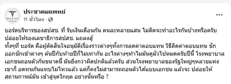 โดยทาง ประชาคมแพทย์ โพสต์ถึงเรื่องนี้ว่า บอร์ดบริหารของสปสช. ที่ รับเงินเดือนกัน คนละหลายแสน ไม่คิดจะทำอะไรกันบ้างหรือครับ ปล่อยให้รองเลขาธิการสปสช. แถลงสู้
