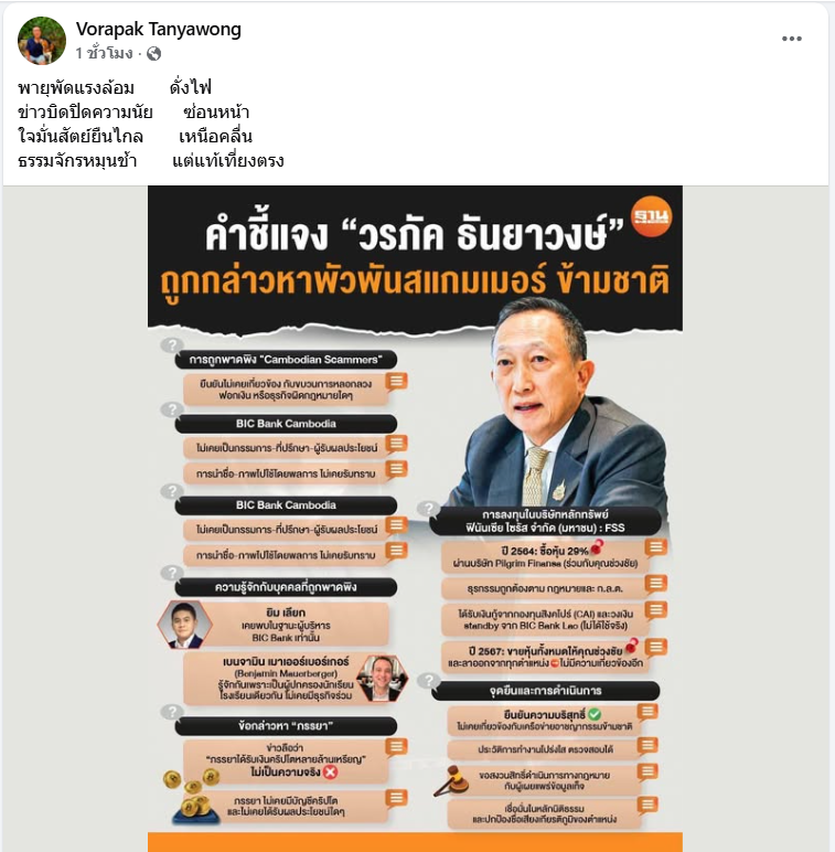 ล่าสุดเฟซบุ๊กของ นายวรภัค ธันยาวงษ์ โพสต์ข้อความระบุว่า