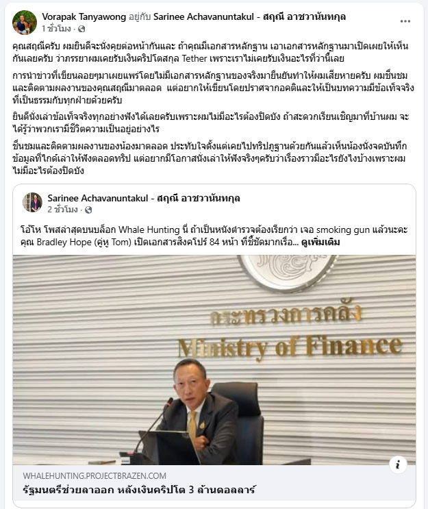 " คุณสฤณีครับ ผมยินดีจะนั่งคุยต่อหน้ากันและ ถ้าคุณมีเอกสารหลักฐาน เอาเอกสารหลักฐานมาเปิดเผยให้เห็นกันเลยครับ ว่าภรรยาผมเคยรับเงินคริปโตสกุล Tether เพราะเราไม่เคยรับเงินอะไรที่ว่านี้เลย