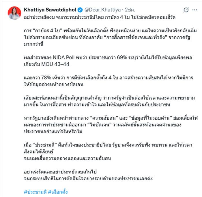 เมื่อวันที่ 24 ตุลาคม 2568 น.ส.ขัตติยา สวัสดิผล สส.บัญชีรายชื่อ และรองโฆษกพรรคเพื่อไทย โพสต์ข้อความผ่าน X ว่า อย่าประหยัดงบจนกระทบประชาธิปไตย กาบัตร 4 ใบ ไม่ใช่กดบัตรคอนเสิร์ต