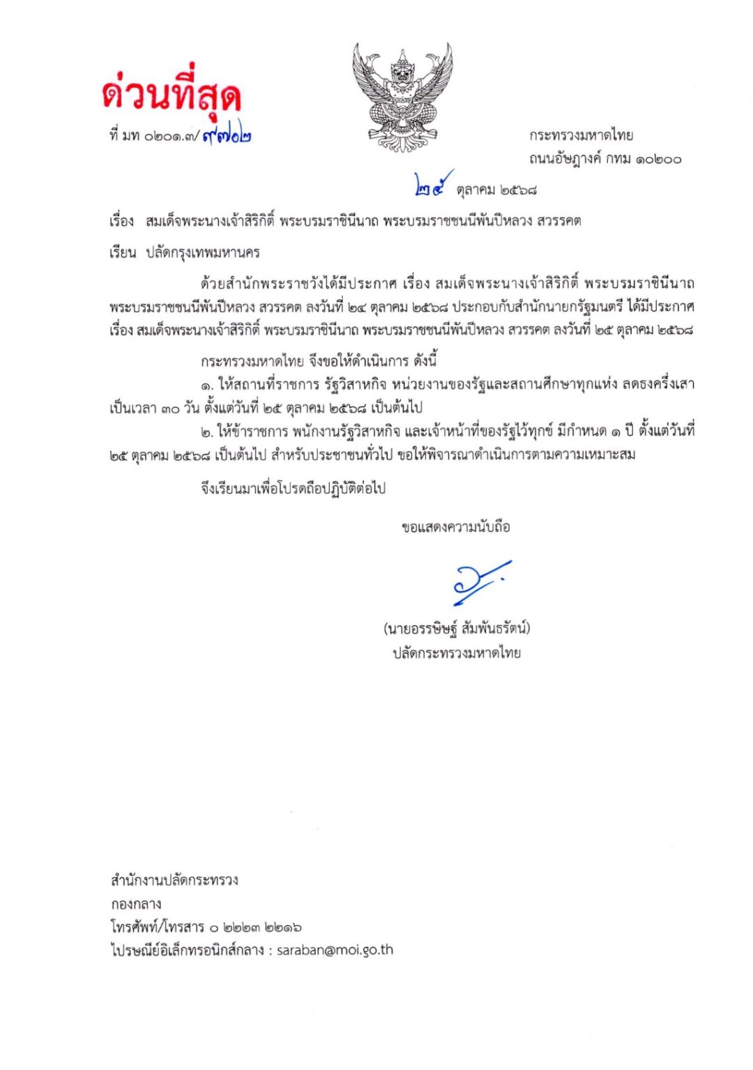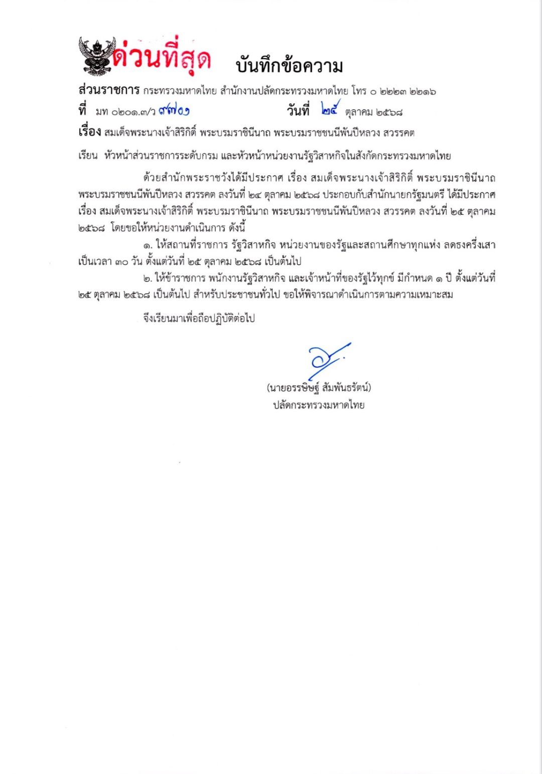 ๑. ให้สถานที่ราชการ รัฐวิสาหกิจ หน่วยงานของรัฐและสถานศึกษาทุกแห่ง ลดธงครึ่งเสา เป็นเวลา ๓๐ วัน ตั้งแต่วันที่ ๒๕ ตุลาคม ๒๕๖๘ เป็นต้นไป