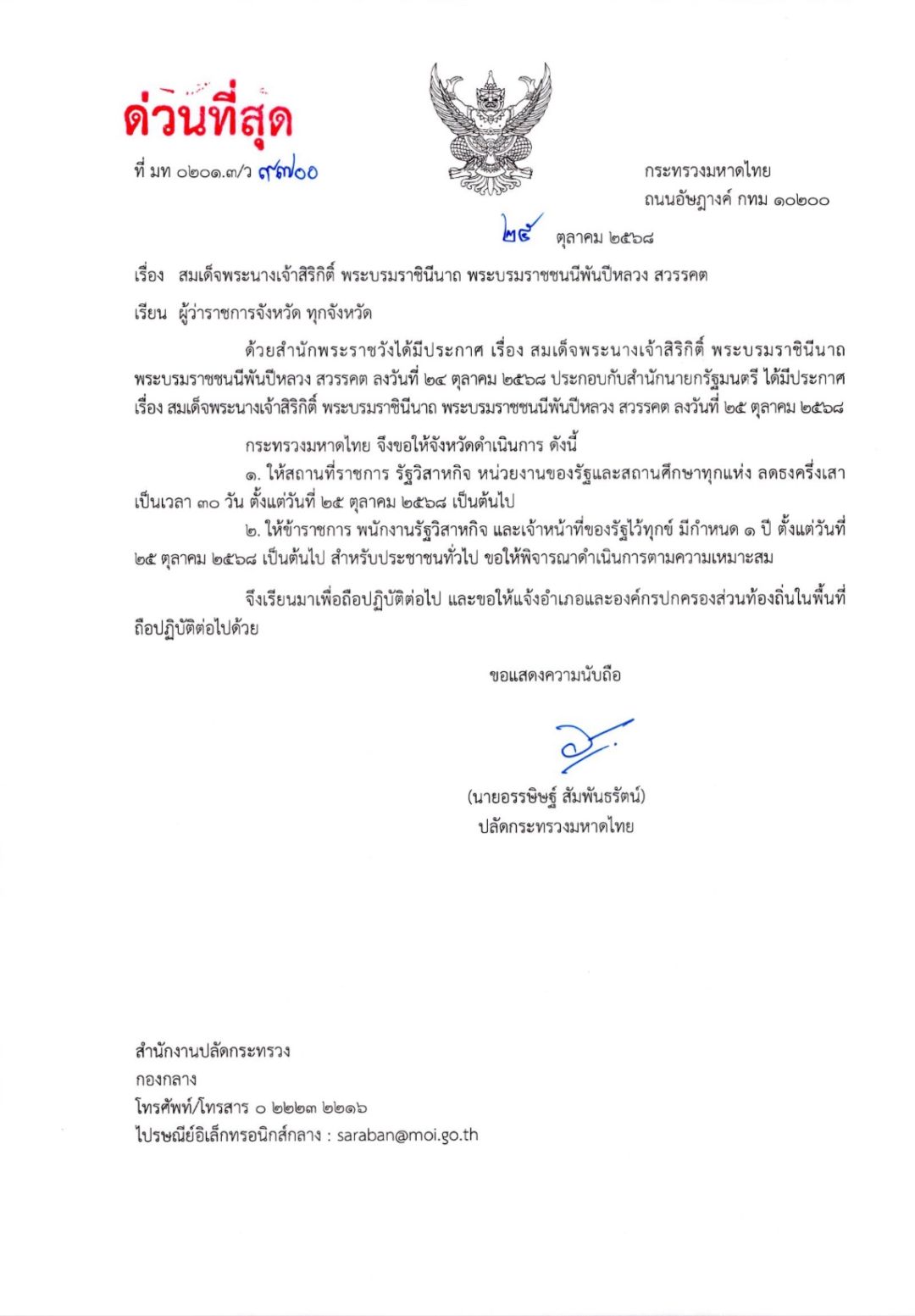 25 ตุลาคม 2568 นายอรรษิษฐ์ สัมพันธรัตน์ ปลัดกระทรวงมหาดไทย ส่งหนังสือด่วนที่สุด เรื่อง สมเด็จพระนางเจ้าสิริกิติ์ พระบรมราชินีนาถ พระบรมราชชนนีพ้นปีหลวง สวรรรคต ถึง ผู้ว่าราชการจังหวัดทุกจังหวัด ปลัดกรุงเทพมหานคร และรัฐวิสาหกิจในสังกัด ขอให้ดำเนินการดังนี้