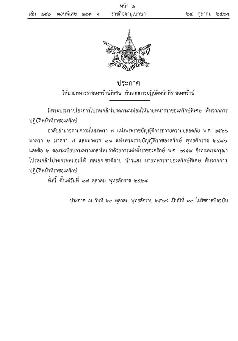 วันที่ 25 ตุลาคม 2568 เว็บไซต์ราชกิจจานุเบกษา เผยแพร่ประกาศ ให้นายทหารราชองครักษ์พิเศษ พ้นจากการปฏิบัติหน้าที่ราชองครักษ์ เมื่อวันที่ 24 ตุลาคม 2569 ความว่า มีพระบรมราชโองการโปรดเกล้าโปรดกระหม่อมให้นายทหารราชองครักษ์พิเศษ พ้นจากการ ปฏิบัติหน้าที่ราชองครักษ์ อาศัยอำนาจตามความในมาตรา 7 แห่งพระราชบัญญัติการถวายความปลอดภัย พ.ศ. 2560 มาตรา 6 มาตรา 7 และมาตรา 11 แห่งพระราชบัญญัติราชองครักษ์ พุทธศักราช 2480 และข้อ 6 ของระเบียบกระทรวงกลาโหมว่าด้วยการแต่งตั้งราชองครักษ์ พ.ศ. 2559 จึงทรงพระกรุณาโปรดเกล้าโปรดกระหม่อมให้ พลเอก ชาติชาย น้าวแสง นายทหารราชองครักษ์พิเศษ พ้นจากการปฏิบัติหน้าที่ราชองครักษ์