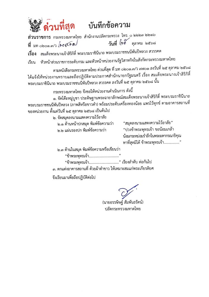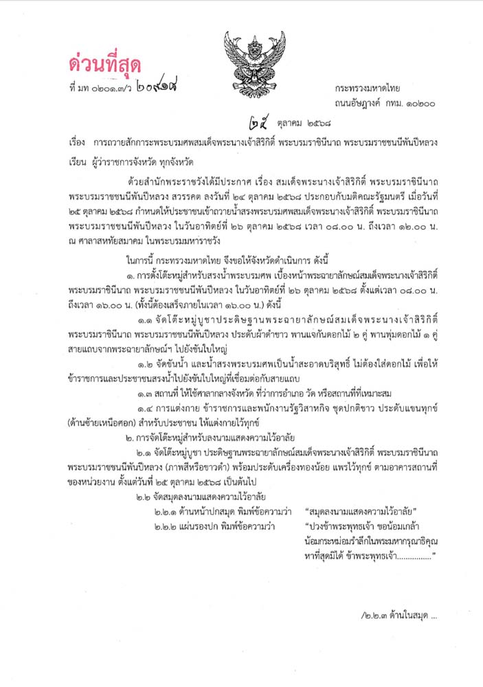 วันที่ 25 ตุลาคม 2568 นายอรรษิษฐ์ สัมพันธรัตน์ ปลัดกระทรวงมหาดไทย ได้ร่อนหนังสือ เรื่อง การถวายสักการะพระบรมศพสมเด็จพระนางเจ้าสิริกิติ์ พระบรมราชินีนาถ พระบรมราชชนนีพันปีหลวง