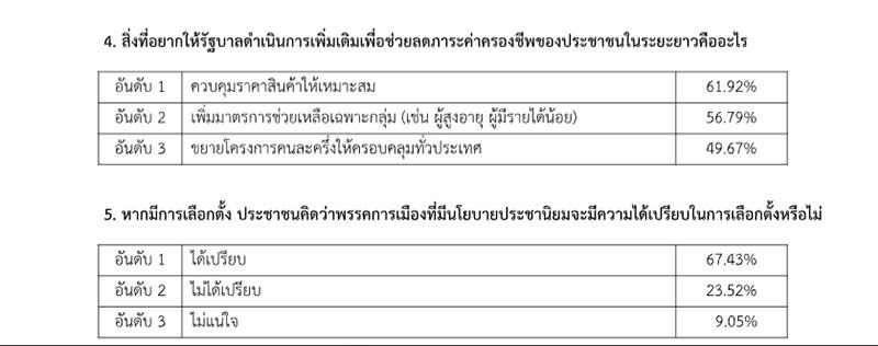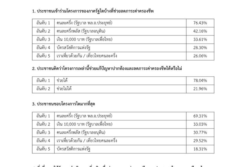รองศาสตราจารย์ ดร.เขมภัทท์ เย็นเปี่ยม อาจารย์ประจำหลักสูตรรัฐประศาสนศาสตรบัณฑิตโรงเรียนกฎหมายและการเมือง มหาวิทยาลัยสวนดุสิต กล่าวว่า ผลสำรวจสะท้อนให้เห็นว่าการแก้ปัญหาปากท้องในยุคที่เศรษฐกิจตกต่ำ ค่าครองชีพสูงมากขึ้นเป็นนโยบายที่ประชาชนต้องการให้รัฐบาลแก้ปัญหามากที่สุดโดยเฉพาะการที่รัฐบาลมีโครงการช่วยเหลือประชาชนให้มีกำลังซื้อในการจับจ่ายใช้สอยเพื่อการบริโภคสินค้าและการบริการช่วยเหลือผู้ประกอบขนาดเล็กและร้านค้ารายย่อยให้มีรายได้พยุงกิจการให้ดำเนินต่อไปได้เป็นการกระตุ้นให้เศรษฐกิจกลับมามีความคึกคัก ทำให้มีเงินหมุนเวียนในระบบเศรษฐกิจได้คล่องตัวมากขึ้น