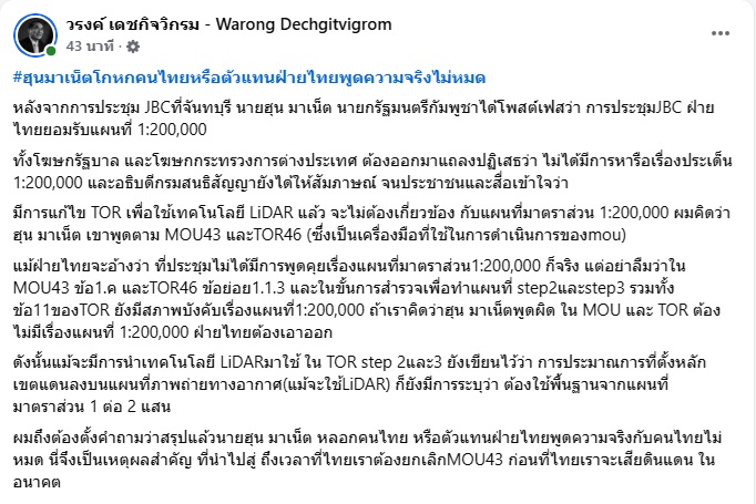 หลังจากการประชุม JBCที่จันทบุรี นายฮุน มาเน็ต นายกรัฐมนตรีกัมพูชาได้โพสต์เฟสว่า การประชุมJBC ฝ่ายไทยยอมรับแผนที่ 1:200,000