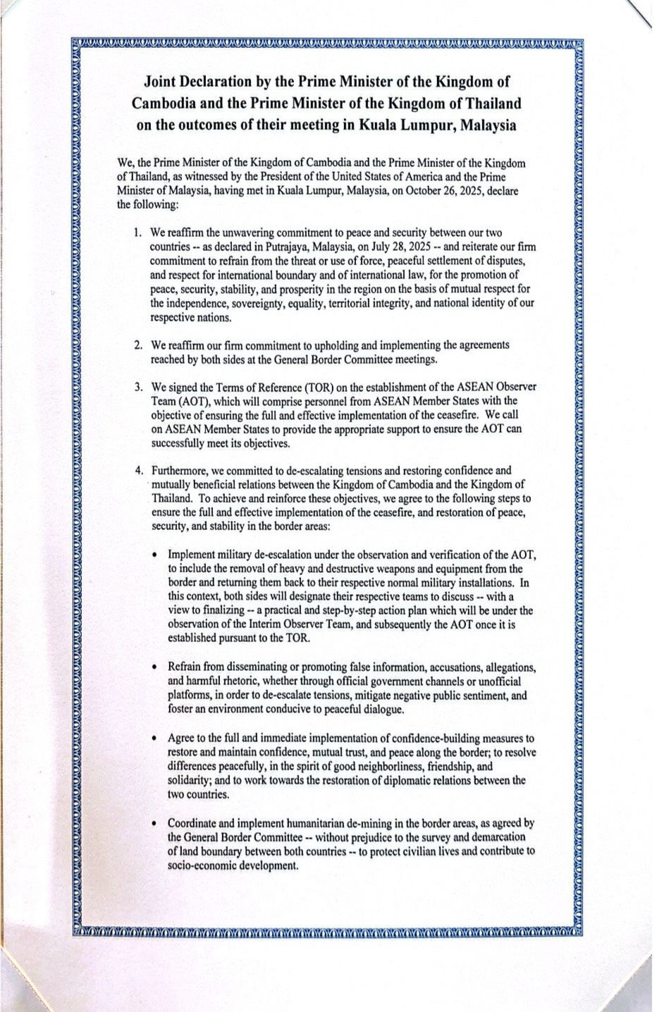 เมื่อวันที่ 26 ต.ค.2568 นายสิริพงศ์ อังคสกุลเกียรติ โฆษกประจำสำนักนายกรัฐมนตรี เปิดเผยว่า การลงนาม Joint Declaration by the Prime Minister of the Kingdom of Cambodia and the Prime Minister of the Kingdom of Thailand on the outcomes of their meeting in Kuala Lumpur, Malaysia โดยนายอนุทิน ชาญวีรกูล นายกรัฐมนตรีและรัฐมนตรีว่าการกระทรวงมหาดไทย ร่วมกับสมเด็จฯ ฮุน มาเนต นายกรัฐมนตรีราชอาณาจักรกัมพูชา ณ กรุงกัวลาลัมเปอร์ ประเทศมาเลเซีย โดยมีประธานาธิบดีโดนัลด์ เจ. ทรัมป์ แห่งสหรัฐอเมริกา และนายกรัฐมนตรีอันวาร์ อิบราฮิม แห่งมาเลเซีย ประธานอาเซียน เข้าร่วมเป็นสักขีพยาน ถือเป็นก้าวสำคัญของทั้งสองประเทศ โดย Joint Declaration ที่มีการลงนามในวันนี้ มีสาระสำคัญ ดังนี้