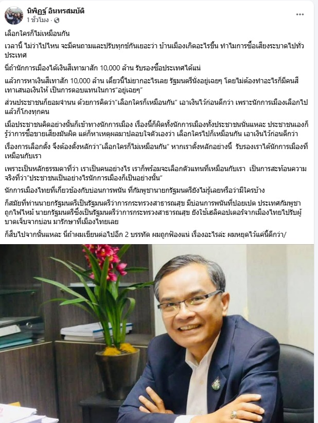 27 ตุลาคม 2568 นายนิพิฏฐ์ อินทรสมบัติ อดีตสส.พัทลุง โพสต์ข้อความผ่านเฟซบุ๊ก หัวข้อ “เลือกใครก็ไม่เหมือนกัน” ระบุว่า...