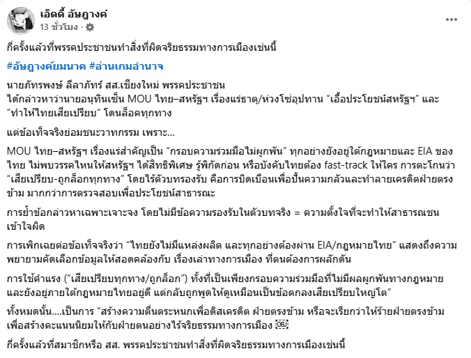 การใช้คำแรง (“เสียเปรียบทุกทาง/ถูกล็อก”) ทั้งที่เป็นเพียงกรอบความร่วมมือที่ไม่มีผลผูกพันทางกฎหมาย และยังอยู่ภายใต้กฎหมายไทยอยู่ดี แต่กลับถูกพูดให้ดูเหมือนเป็นข้อตกลงเสียเปรียบใหญ่โต”