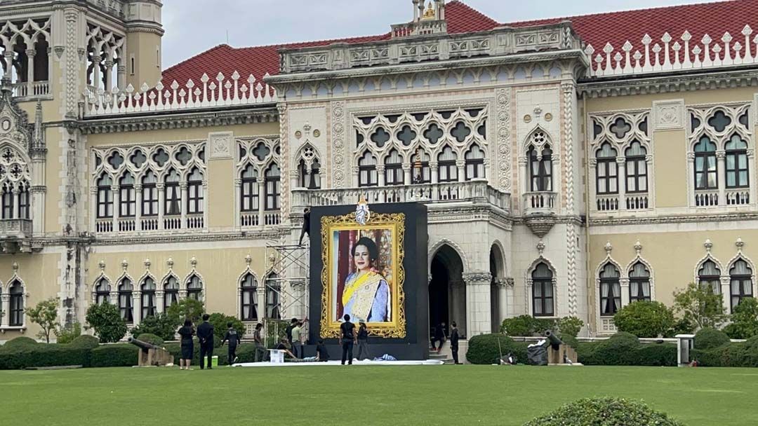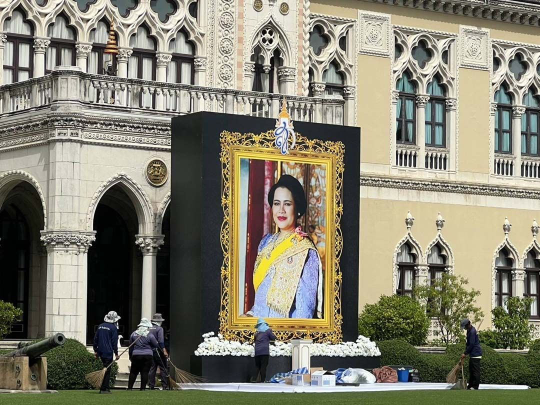 ทำเนียบรัฐบาล อัญเชิญพระฉายาลักษณ์ สมเด็จพระบรมราชชนนีพันปีหลวง ประดิษฐาน หน้าตึกไทยคู่ฟ้า ก่อนจัดพิธีตักบาตรครบสัตตมวาร (7 วัน) ถวายเป็นพระราชกุศลเช้าวันพรุ่งนี้