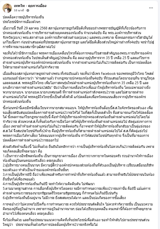 30 ตุลาคม 2568 นายเทพไท เสนพงศ์ อดีต สส.นครศรีธรรมราช โพสต์คลิป พร้อมเนื้อหาบนเฟซบุ๊ก “เทพไท – คุยการเมือง” หัวข้อ “ปลดล็อกวาระผู้บริหารท้องถิ่น ประโยชน์นักการเมืองล้วนๆ” ระบุว่า...