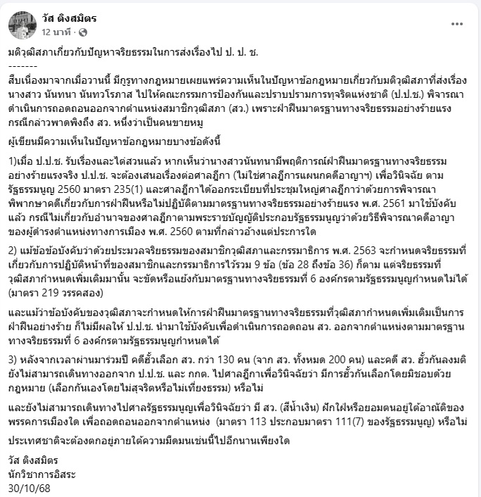 30 ตุลาคม 2568 นายวัส ติงสมิตร นักวิชาการอิสระ อดีตผู้พิพากษาอาวุโสในศาลฎีกา และอดีตประธานกรรมการสิทธิมนุษยชนแห่งชาติ (กสม.) โพสต์เฟซบุ๊กในหัวข้อ “มติวุฒิสภาเกี่ยวกับปัญหาจริยธรรมในการส่งเรื่องไป ป. ป. ช.” ดังนี้...