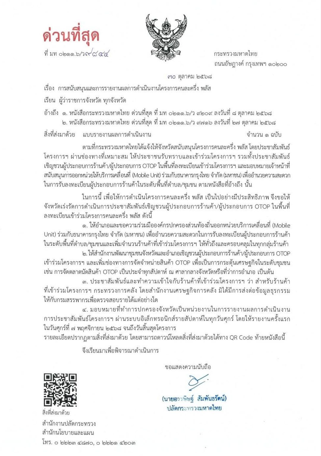เมื่อวันที่ 30 ตุลาคม 2568 นายอรรษิษฐ์ สัมพันธรัตน์ ปลัดกระทรวงมหาดไทย ได้ออกหนังสือกระทรวงมหาดไทย ถึงผู้ว่าราชการจังหวัดทุกจังหวัด เรื่อง การรายงานผลการดำเนินงานสนับสนุนโครงการคนละครึ่งพลัส เพื่อให้การดำเนินโครงการคนละครึ่งพลัส เป็นไปอย่างมีประสิทธิภาพ โดยมอบหมายให้จังหวัดเร่งรัดการดำเนินการประชาสัมพันธ์เชิญชวนผู้ประกอบการร้านค้า/ผู้ประกอบการ OTOP ในพื้นที่ลงทะเบียนเข้าร่วมโครงการคนละครึ่งพลัส ดังนี้