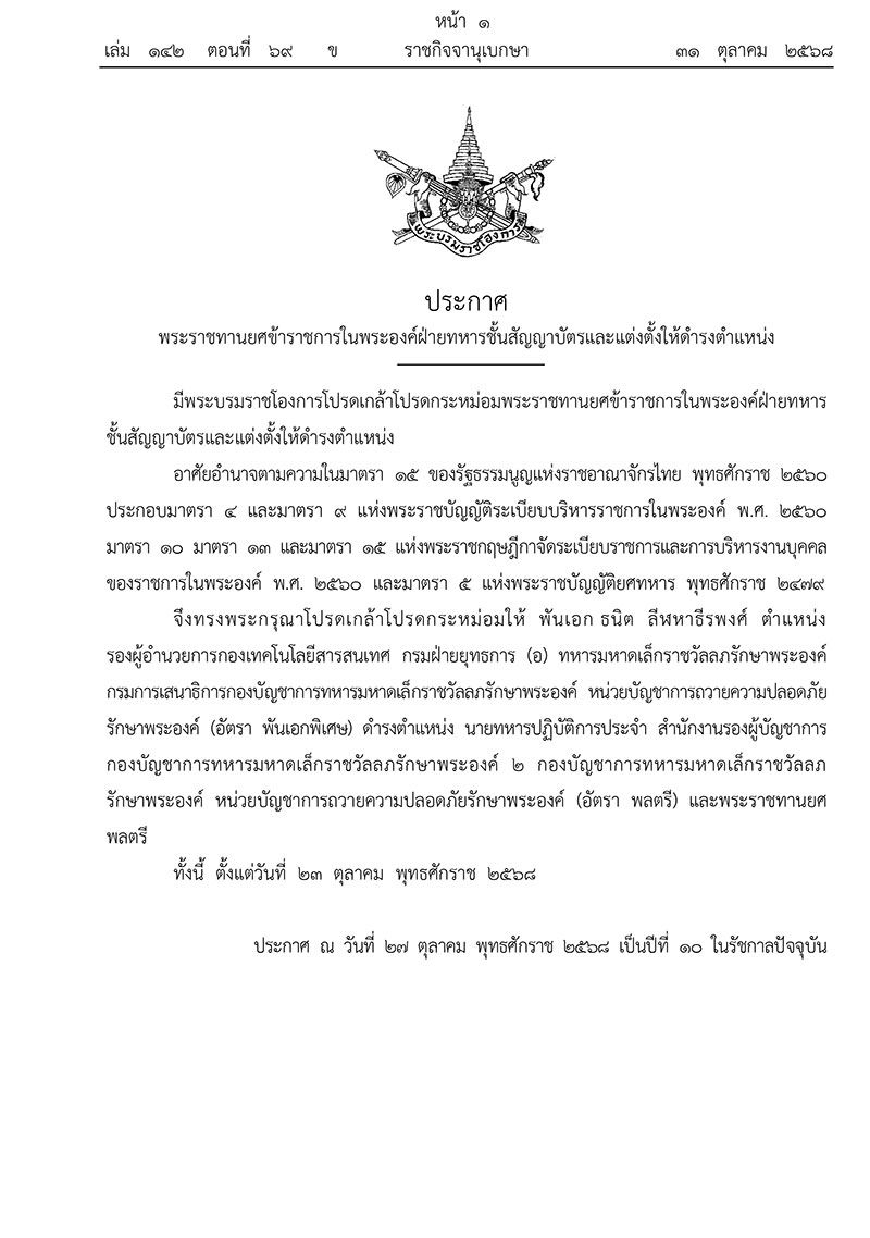 วันที่ 31 ตุลาคม 2568 เว็บไซต์ราชกิจจานุเบกษา เผยแพร่ประกาศ พระราชทานยศข้าราชการในพระองค์ฝ่ายทหารชั้นสัญญาบัตรและแต่งตั้งให้ดำรงตำแหน่ง