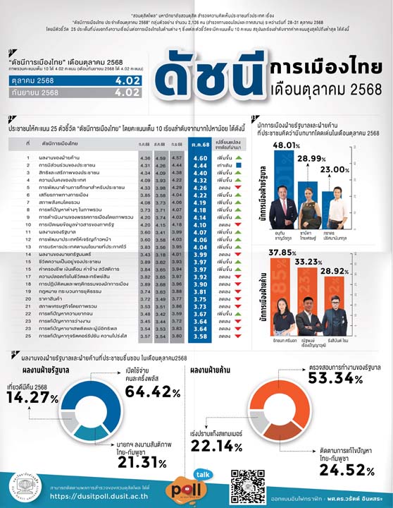 2 พฤศจิกายน 2568 “สวนดุสิตโพล” มหาวิทยาลัยสวนดุสิต สำรวจความคิดเห็นประชาชนทั่วประเทศ เรื่อง “ดัชนีการเมืองไทย ประจำเดือนตุลาคม 2568” กลุ่มตัวอย่าง จำนวน 2,126 คน (สำรวจทางออนไลน์และภาคสนาม) ระหว่างวันที่ 28-31 ตุลาคม 2568 พบว่า กลุ่มตัวอย่างให้คะแนนภาพรวมดัชนีการเมืองไทยประจำเดือนตุลาคม 2568 เฉลี่ย 4.02 คะแนน เท่ากับเดือนกันยายน 2568 ที่ได้ 4.02 คะแนน