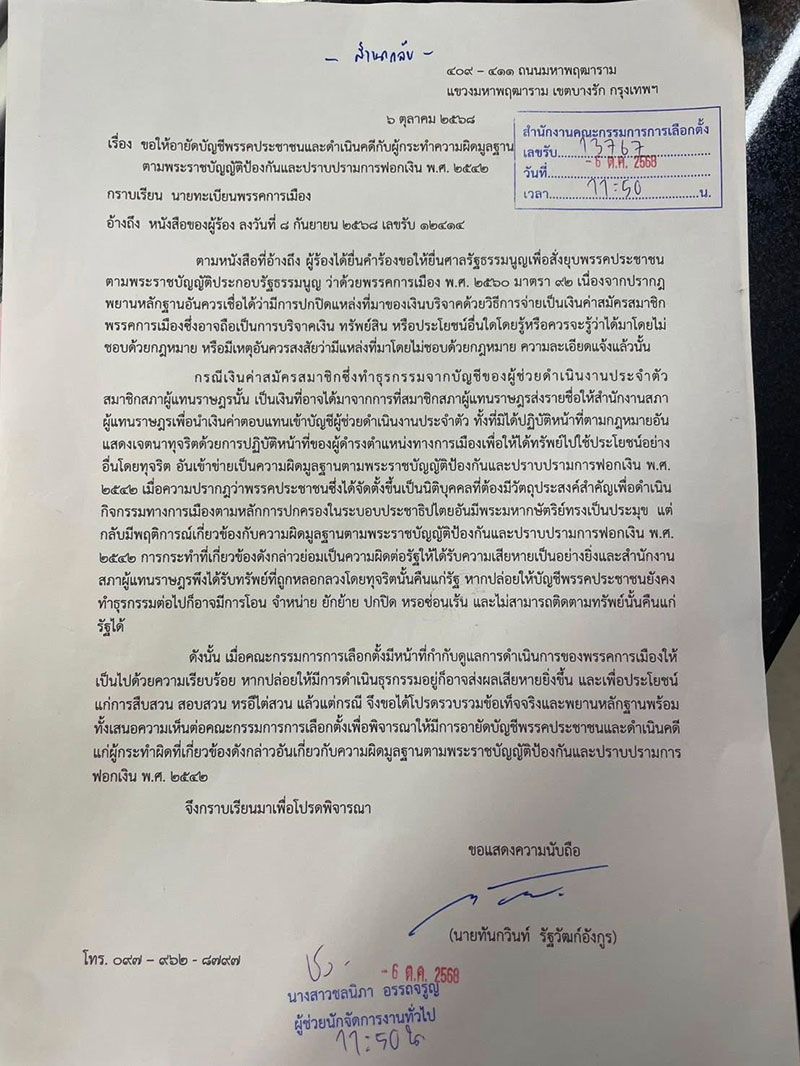 ดังนั้น เมื่อคณะกรรมการการเลือกตั้งมีหน้าที่กำกับดูแลการดำเนินการของพรรคการเมืองให้เป็นไปด้วยความเรียบร้อย หากปล่อยให้มีการดำเนินธุรกรรมอยู่ก็อาจส่งผลเสียหายยิ่งขึ้น และเพื่อประโยชน์แก่การสืบสวน สอบสวน หรือไต่สวน แล้วแต่กรณี จึงขอได้โปรดรวบรวมข้อเท็จจริงและพยานหลักฐานพร้อมทั้งเสนอความเห็นต่อคณะกรรมการการเลือกตั้งเพื่อพิจารณาให้มีการอายัดบัญชีพรรคประชาชนและดำเนินคดีแก่ผู้กระทำผิดที่เกี่ยวข้องดังกล่าวอันเกี่ยวกับความผิดมูลฐานตามพระราชบัญญัติป้องกันและปราบปรามการฟอกเงิน พ.ศ. 2542