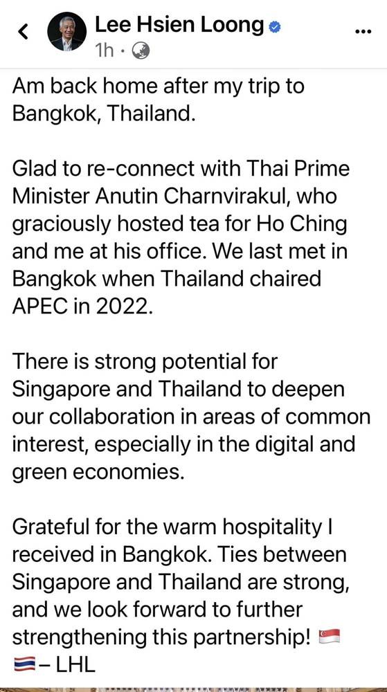 นายสิริพงศ์ เปิดเผยว่า หลังการหารือ นายลี เซียน ลุง ได้โพสต์ข้อความสะท้อนความรู้สึกผูกพันกับประเทศไทยว่า การได้กลับมาพบปะนายกรัฐมนตรี อีกครั้ง “รู้สึกดีใจที่ได้ reconnect” พร้อมขอบคุณน้ำใจและการต้อนรับอย่างอบอุ่นที่ไทยให้แก่ท่านและภริยา โดยระบุว่า “สายสัมพันธ์ไทย–สิงคโปร์แข็งแกร่ง และยังมีพื้นที่ให้เราต่อยอดความร่วมมือร่วมกันได้อีกมาก โดยเฉพาะในเศรษฐกิจดิจิทัลและเศรษฐกิจสีเขียว”