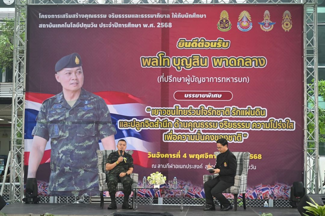 เมื่อวันที่ 4 พ.ย.2568 ที่ลานกีฬาอเนกประสงค์ สถาบันเทคโนโลยีปทุมวัน พล.ท.บุญสิน พาดกลาง ที่ปรึกษาผู้บัญชาการทหารบก และอดีตแม่ทัพภาคที่ 2 (มทภ.2) ได้รับเชิญมาเป็นวิทยากรบรรยายพิเศษ ในหัวข้อ "เยาวชนไทยร่วมใจรักชาติ รักแผ่นดินและปลูกจิตสำนึก ด้านคุณธรรม จริยธรรม ความโปร่งใส เพื่อความมั่นคงของชาติ" ให้กับนักศึกษาสถาบันเทคโนโลยีปทุมวัน