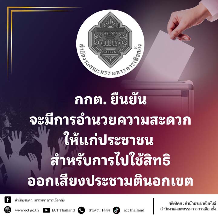 สำนักงานคณะกรรมการการเลือกตั้ง ขอเรียนว่า การดำเนินการจัดการออกเสียงประชามตินอกเขตทางไปรษณีย์ พร้อมกับการลงคะแนนเลือกตั้ง สส.ล่วงหน้า อยู่ระหว่างสำนักงานคณะกรรมการการเลือกตั้ง เสนอระเบียบฯ และแนวทางการดำเนินการ เพื่อนำเข้าที่ประชุมคณะกรรมการการเลือกตั้งพิจารณาเรื่องดังกล่าว โดยคำนึงถึงการอำนวยความสะดวกให้แก่ประชาชนภายใต้บทบัญญัติของกฎหมายที่กำหนดไว้ โดยสามารถสอบถามรายละเอียดเกี่ยวกับการออกเสียงประชามติได้ที่เว็บไซต์สำนักงานคณะกรรมการการเลือกตั้ง www.ect.go.th หรือบริการสายด่วน 1444