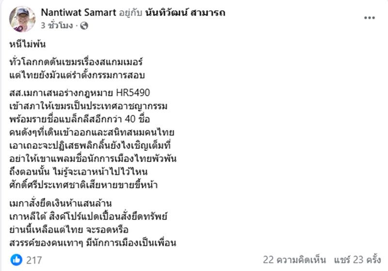 วันที่ 5 พฤศจิกายน 2568 นายนันทิวัฒน์ สามารถ อดีตเลขานุการรัฐมนตรีว่าการกระทรวงการต่างประเทศ และอดีตรองผู้อำนวยการสำนักข่าวกรองแห่งชาติ โพสต์ข้อความผ่านเฟซบุ๊ก ระบุว่า