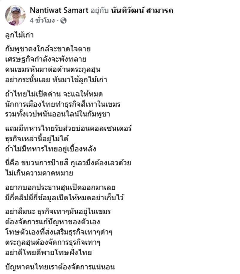 วันที่ 7 พฤศจิกายน 2568 นายนันทิวัฒน์ สามารถ อดีตเลขานุการรัฐมนตรีว่าการกระทรวงการต่างประเทศ และอดีตรองผู้อำนวยการสำนักข่าวกรองแห่งชาติ โพสต์ข้อความระุบว่า ลูกไม้เก่า