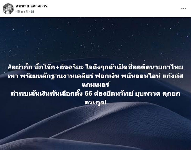วันที่ 7 พฤศจิกายน 2568 นายสมชาย แสวงการ อดีตสมาชิกวุฒิสภา (สว.) โพสต์ข้อควาทผ่านเฟซบุ๊ก Somchai Swangkarn ระบุข้อความว่า #อย่ากั๊ก บิ๊กโจ๊ก+อัจฉริยะ ใจถึงๆกล้าเปิดชื่ออดีตนายกฯไทยเทา พร้อมหลักฐานงานเคลียร์ ฟอกเงิน พนันออนไลน์ แก้งค์สแกมเมอร์ ถ้าพบเส้นเงินพันเลือกตั้ง 66 ต้องยึดทรัพย์ ยุบพรรค คุกยกตระกูล!
