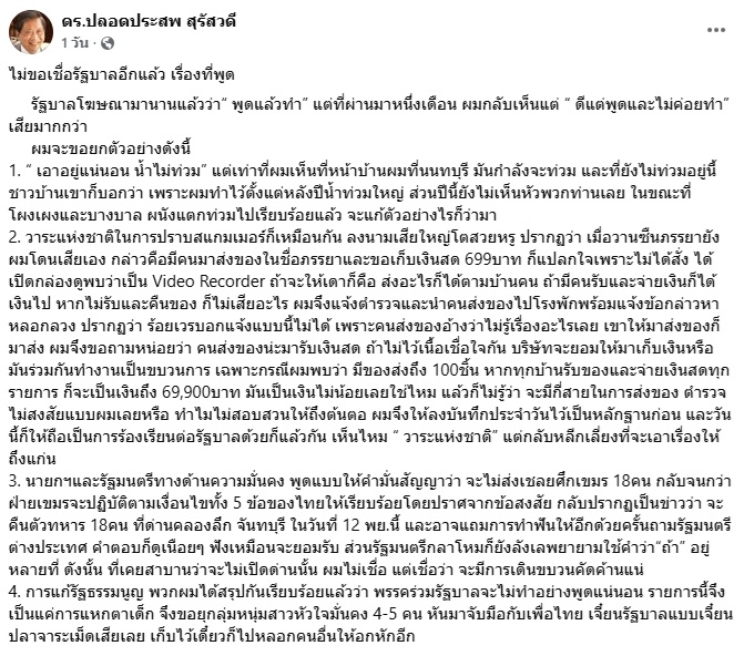 9 พฤศจิกายน 2568 ดร.ปลอดประสพ สุรัสวดี อดีตรองนายกรัฐมนตรี โพสต์เฟซบุ๊กหัวข้อ “ไม่ขอเชื่อรัฐบาลอีกแล้ว เรื่องที่พูด” ระบุว่า...
