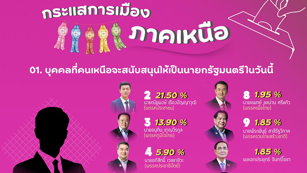 จากการสำรวจเมื่อถามถึงบุคคลที่คนเหนือจะสนับสนุนให้เป็นนายกรัฐมนตรีในวันนี้ พบว่า อันดับ 1 ร้อยละ 36.60 ระบุว่า ยังหาคนที่เหมาะสมไม่ได้ อันดับ 2 ร้อยละ 21.50 ระบุว่าเป็น นายณัฐพงษ์ เรืองปัญญาวุฒิ (พรรคประชาชน) อันดับ 3 ร้อยละ 13.90 ระบุว่าเป็น นายอนุทิน ชาญวีรกูล (พรรคภูมิใจไทย) อันดับ 4 ร้อยละ 5.90 ระบุว่าเป็น นายอภิสิทธิ์ เวชชาชีวะ (พรรคประชาธิปัตย์)