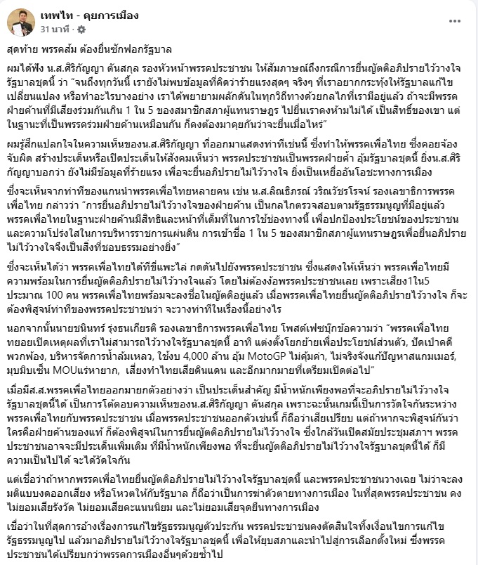 ผมได้ฟัง น.ส.ศิริกัญญา ตันสกุล รองหัวหน้าพรรคประชาชน ให้สัมภาษณ์ถึงกรณีการยื่นญัตติอภิปรายไว้วางใจรัฐบาลชุดนี้ ว่า “จนถึงทุกวันนี้ เรายังไม่พบข้อมูลที่คิดว่าร้ายแรงสุดๆ จริงๆ ที่เราอยากกระทุ้งให้รัฐบาลแก้ไขเปลี่ยนแปลง หรือทำอะไรบางอย่าง เราได้พยายามผลักดันในทุกวิถีทางด้วยกลไกที่เรามีอยู่แล้ว ถ้าจะมีพรรคฝ่ายค้านที่มีเสียงร่วมกันเกิน 1 ใน 5 ของสมาชิกสภาผู้แทนราษฎร ไปยื่นเราคงห้ามไม่ได้ เป็นสิทธิ์ของเขา แต่ในฐานะที่เป็นพรรคร่วมฝ่ายค้านเหมือนกัน ก็คงต้องมาคุยกันว่าจะยื่นเมื่อไหร่”