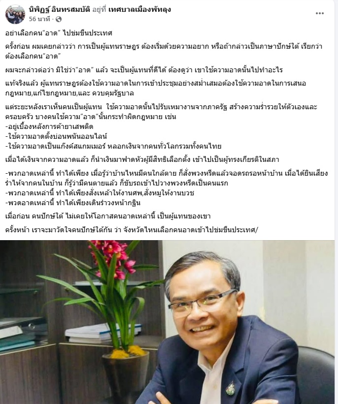 10 พฤศจิกายน 2568 นายนิพิฏฐ์ อินทรสมบัติ อดีต สส.พัทลุง พรรคประชาธิปัตย์ (ปชป.) โพสต์ข้อความผ่านเฟซบุ๊ก หัวข้อ “อย่าเลือกคน “อาด” ไปข่มขืนประเทศ” ระบุว่า...