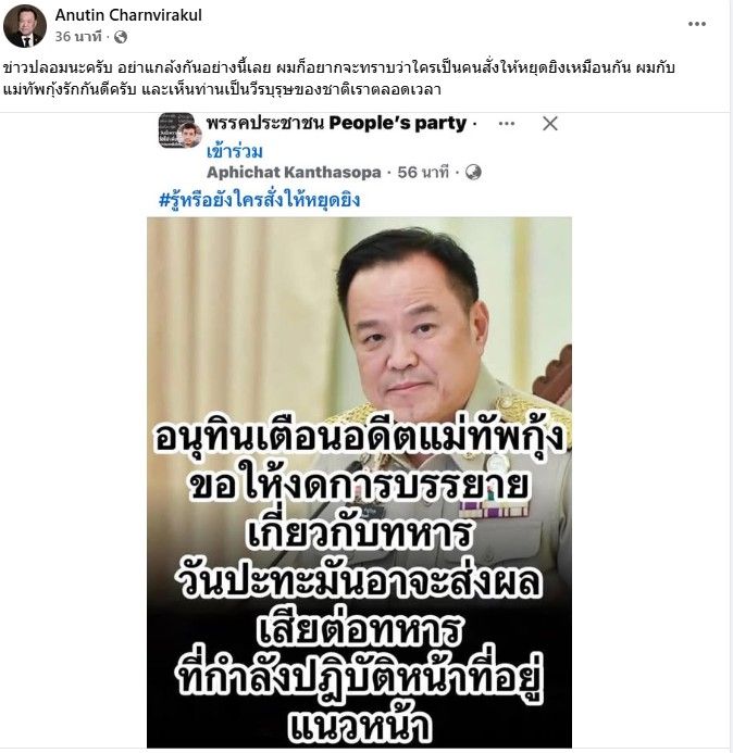 เมื่อวันที่ 10 พ.ย.2568 นายอนุทิน ชาญวีรกูล นายกรัฐมนตรี และรัฐมนตรีว่าการกระทรวงกลาโหม ได้โพสต์ภาพตนเองที่มีคนโพสต์ลงในกลุ่มการเมืองกลุ่มหนึ่ง โดยมีข้อความระบุลงบนภาพว่า "อนุทินเตือนอดีตแม่ทัพกุ้ง ขอให้งดการบรรยายเกี่ยวกับทหาร วันปะทะมันอาจส่งผลเสียต่อทหารที่ปฏิบัติหน้าที่อยู่แนวหน้า" โดยนายอนุทิน ได้ระบุข้อความถึงโพสต์ดังกล่าวว่า "ข่าวปลอมนะครับ อย่าแกล้งกันอย่างนี้เลย ผมก็อยากจะทราบว่าใครเป็นคนสั่งให้หยุดยิงเหมือนกัน ผมกับแม่ทัพกุ้งรักกันดีครับ และเห็นท่านเป็นวีรบุรุษของชาติเราตลอดเวลา"