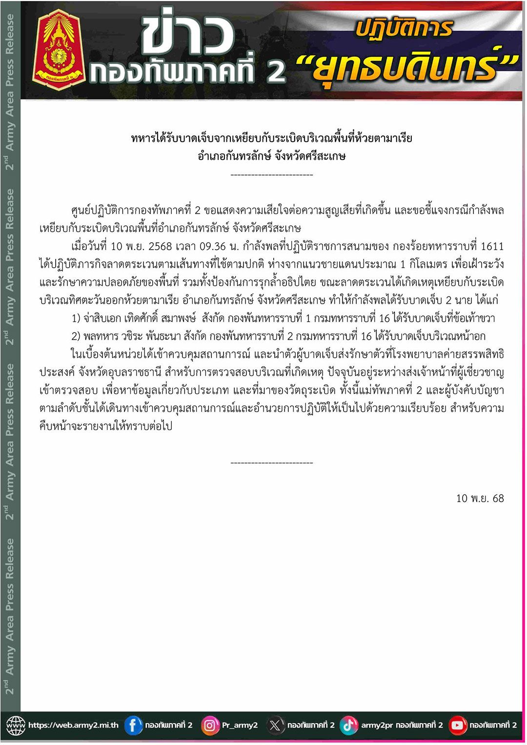เมื่อวันที่ 10 พฤศจิกายน 2568 เพจเฟซบุ๊ก "กองทัพภาคที่ 2" โพสต์ข้อความระบุว่า ศูนย์ปฏิบัติการกองทัพภาคที่ 2 ขอแสดงความเสียใจต่อความสูญเสียที่เกิดขึ้น และขอชี้แจงกรณีกำลังพลเหยียบกับระเบิดบริเวณพื้นที่อำเภอกันทรลักษ์ จังหวัดศรีสะเกษ