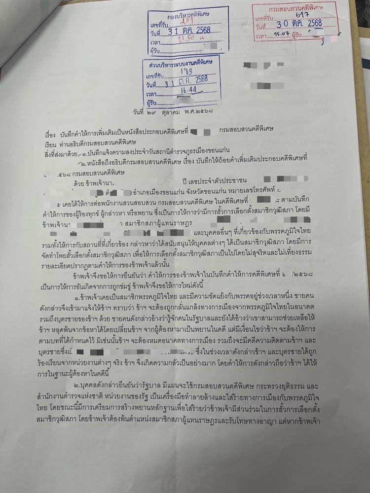 5.เมื่อมีการจัดตั้งรัฐบาลใหม่ ข้าพเจ้ารู้สึกในความปลอดภัยในชีวิต ร่างกาย เสรีภาพ ทรัพย์สิน ชื่อเสียง ของตนเองและครอบครัว เนื่องจากกลุ่มคณะบุคคลที่สมรู้ร่วมคิด ซึ่งมีการข่มขืนใจ บังคับ ขู่เข็ญ ล่อลวง ให้ข้าพเจ้าให้ถ้อยคำใส่ร้ายพรรคภูมิใจไทยไม่ได้มีอำนาจในรัฐบาลแล้ว จึงเป็นเหตุที่ข้าพเจ้าต้องการแก้ไขข้อความให้ตรงกับความเป็นจริง จึงขอให้ถ้อยคำเพิ่มติมเป็นหนังสือเพื่อแก้ไขข้อความดังกล่าวต่อไป