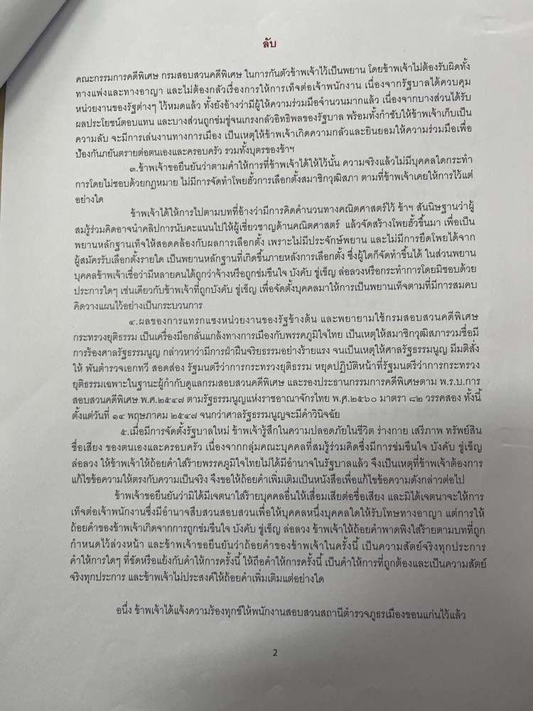 3.ข้าพเจ้าขอยืนยันว่า ตามคำให้การที่ข้าพเจ้าได้ให้ไว้นั้น ความจริงแล้วไม่มีบุคคลใดกระทำการโดยไม่ชอบด้วยกฎหมาย ไม่มีการจัดทำโพยฮั้วการเลือกตั้งสมาชิกวุฒิสภา ตามที่ข้าพเจ้าเคยให้การไว้แต่อย่างใด ข้าพเจ้าได้ให้การไปตามบทที่อ้างว่ามีการคิดคำนวนทางคณิตศาสตร์ไว้ ข้าพเจ้าสันนิษฐานว่าผู้สมรู้ร่วมคิดอาจนำคลิปการนับคะแนนไปให้ผู้เชี่ยวชาญด้านคณิตศาสตร์ แล้วจัดสร้างโพยฮัวขึ้นมา เพื่อเป็นพยานหลักฐานเท็จให้สอดคล้องกับผลการเลือกตั้ง เพราะไม่มีประจักษ์พยาน และไม่มีการยึดโพยได้จากผู้สมัครรับเลือกตั้งรายใด เป็นพยานหลักฐานที่เกิดขึ้นภายหลังการเลือกตั้ง ซึ่งผู้ใดก็จัดทำขึ้นได้ ในส่วนพยานบุคคล ข้าพเจ้าเชื่อว่ามีหลายคนได้ถูกว่าจ้างหรือถูกข่มขืนใจ บังคับ ขู่เข็ญ ล่อลวงหรือกระทำการโดยมิชอบด้วยประการใดๆ เช่นเดียวกับข้าพเจ้าที่ถูกบังคับ ขู่เข็ญ เพื่อจัดตั้งบุคคลมาให้การเป็นพยานเท็จตามที่มีการสมคบ คิดวางแผนไว้อย่างเป็นกระบวนการ