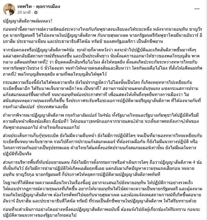 11 พฤศจิกายน 2568 นายเทพไท เสนพงศ์ อดีต สส.นครศรีธรรมราช โพสต์ข้อความผ่านเฟซบุ๊ก “เทพไท – คุยการเมือง” หัวข้อ “ปฏิญญาสันติภาพล้มเหลว?” ระบุว่า...