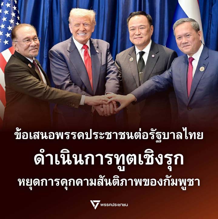 พรรคประชาชนเชื่อมั่นเป็นอย่างยิ่งว่า หากรัฐบาลดำเนินการทางการทูตเชิงรุกอย่างถึงที่สุด จะทำให้ไทยเป็นฝ่ายได้เปรียบในเวทีโลก และสามารถหยุดยั้งพฤติการณ์คุกคามสันติภาพของรัฐบาลกัมพูชาได้ รวมถึงมีความชอบธรรมเพียงพอที่จะอธิบายต่อประชาคมโลก หากจำเป็นต้องยกระดับมาตรการทางทหารเพื่อป้องกันตนเองในอนาคต