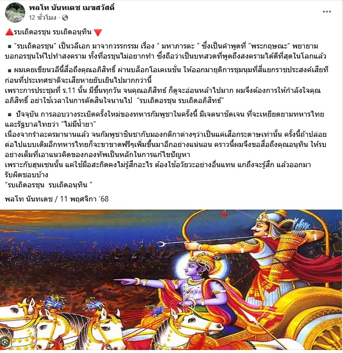 12 พฤศจิกายน 2568 พล.ท.นันทเดช เมฆสวัสดิ์ อดีตหัวหน้าศูนย์ปฏิบัติการพิเศษ ศูนย์รักษาความปลอดภัยแห่งชาติ (ศรภ.) โพสต์เฟซบุ๊ก หัวข้อ “รบเถิดอรชุน รบเถิดอนุทิน” มีเนื้อหาดังนี้...