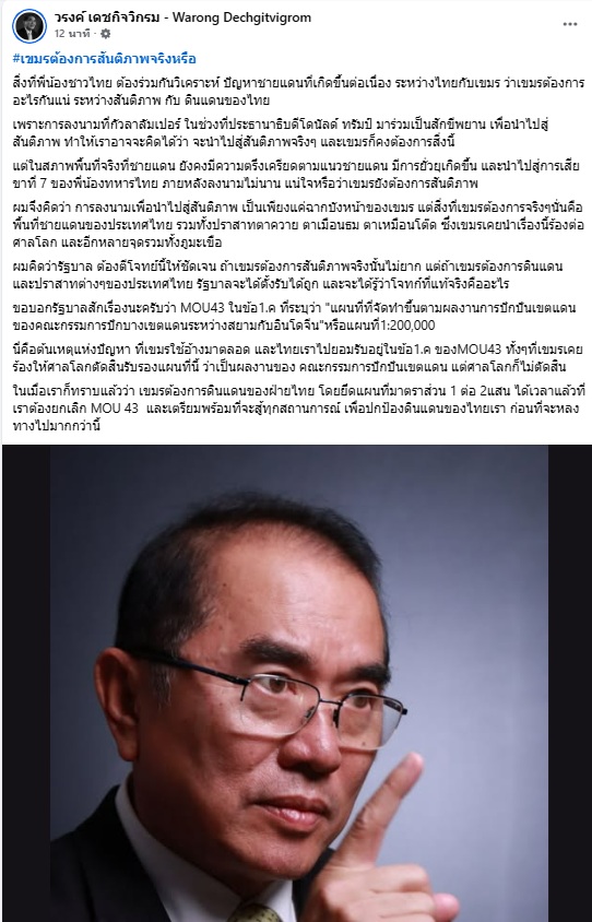 12 พฤศจิกายน 2568 นพ.วรงค์ เดชกิจวิกรม ประธานพรรคไทยภักดี โพสต์ข้อความผ่านเฟซบุ๊ก “วรงค์ เดชกิจวิกรม - Warong Dechgitvigrom” หัวข้อ “เขมรต้องการสันติภาพจริงหรือ” ระบุว่า...