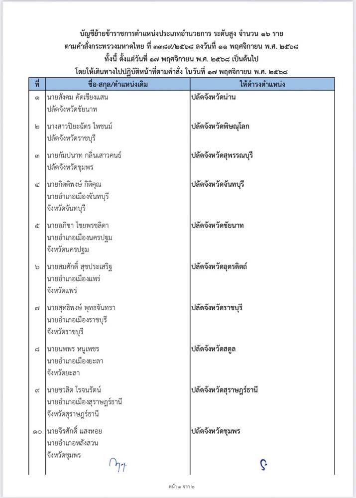 เมื่อวันที่ 12 พฤศจิกายน 2568 ผู้สื่อข่าวรายงานว่า นายอรรษิษฐ์ สัมพันธรัตน์ ปลัดกระทรวงมหาดไทย ได้ลงนามในคำสั่งกระทรวงมหาดไทย เรื่อง ย้ายข้าราชการ ตําแหน่งประเภทบริหาร ระดับต้น (ตําแหน่งรองผู้ว่าราชการจังหวัด) จํานวน 11 ราย (ตามคําสั่ง ที่ 3388/ 2568 ลงวันที่ 11 พฤศจิกายน 2568) โดยกําหนดให้เดินทางไปปฎิบัติหน้าที่ตามคําสั่งในวันที่ 17 พฤศจิกายน 2568 ประกอบด้วย