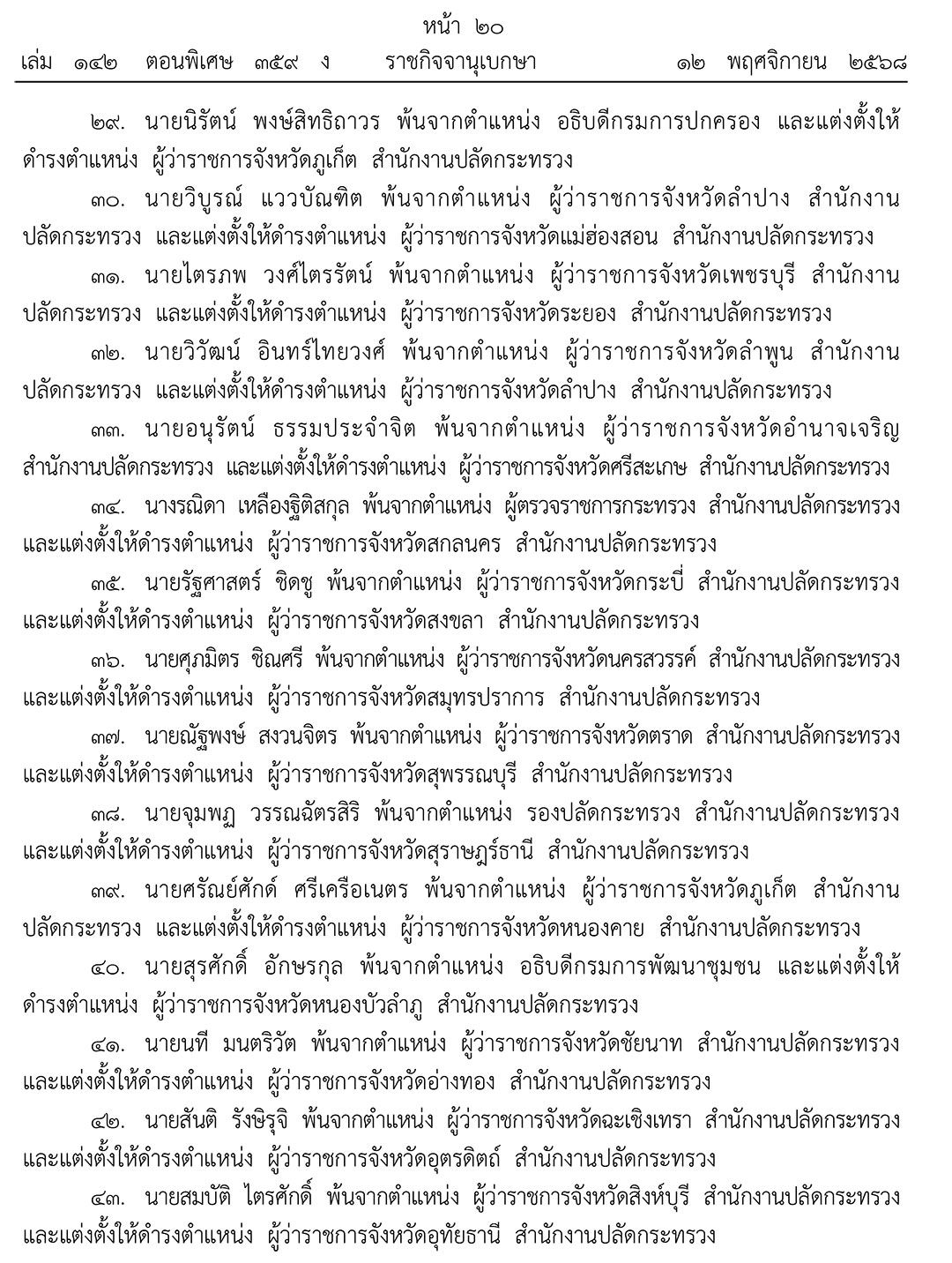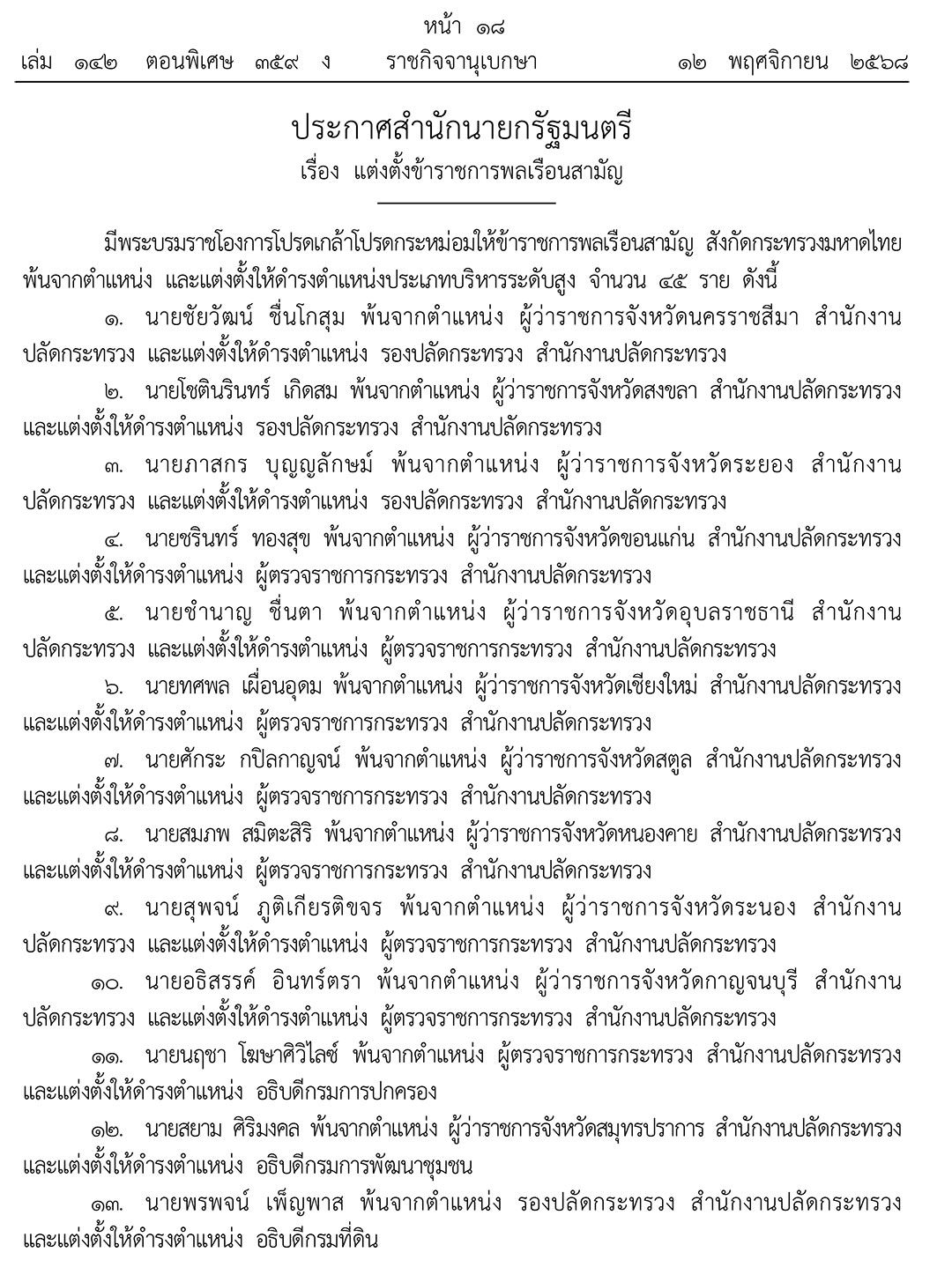 เมื่อวันที่ 12 พฤศจิกายน 2568 เว็บไซต์ราชกิจจานุเบกษา เผยแพร่ประกาศสำนักนายกรัฐมนตรี เรื่อง แต่งตั้งข้าราชการพลเรือนสามัญ ความว่า มีพระบรมราชโองการโปรดเกล้าโปรดกระหม่อมให้ข้าราชการพลเรือนสามัญ สังกัดกระทรวงมหาดไทย พ้นจากตำแหน่ง และแต่งตั้งให้ดำรงตำแหน่งประเภทบริหารระดับสูง จำนวน 45 ราย ดังนี้