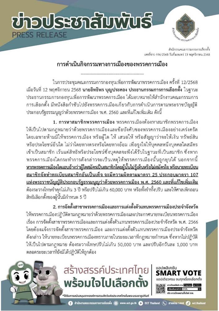 เมื่อวันที่ 13 พฤสจิกายน 2568 นายอิทธิพร บุญประคอง ประธานกรรมการการเลือกตั้ง (กกต.) ในฐานะประธานกรรมการกองทุนเพื่อการพัฒนาพรรคการเมือง มอบหมายให้สำนักงาน กกต.มีหนังสือกำชับไปยังพรรคการเมือง เกี่ยวกับการดำเนินการตาม พ.ร.ป.ว่าด้วยพรรคการเมือง พ.ศ.2560 ใน 5 เรื่องสำคัญ ดังนี้