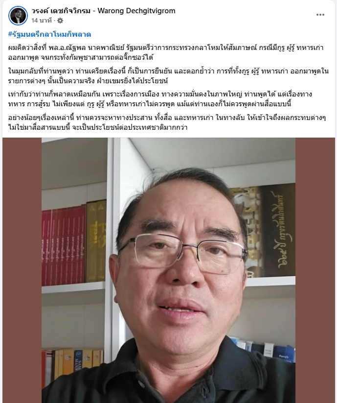 14 พฤศจิกายน 2568 นพ.วรงค์ เดชกิจวิกรม ประธานพรรคไทยภักดี โพสต์ข้อความลงบนเฟซบุ๊ก “วรงค์ เดชกิจวิกรม - Warong Dechgitvigrom” หัวข้อ “รัฐมนตรีกลาโหมก็พลาด” ระบุว่า...