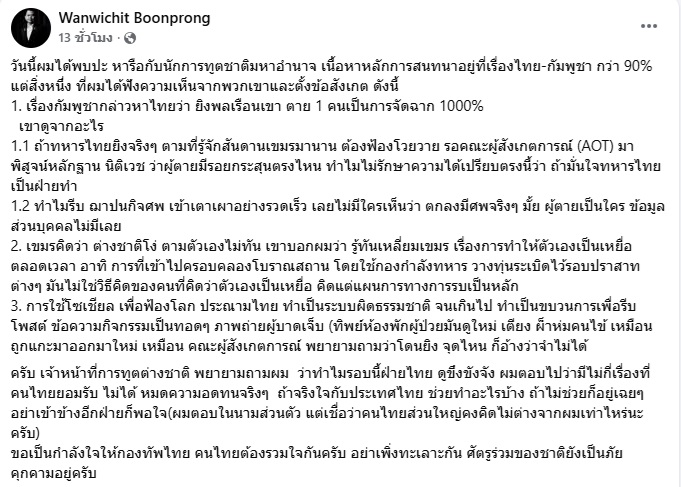 14 พฤศจิกายน 2568 นายวันวิชิต บุญโปร่ง ที่ปรึกษา รมว.กลาโหม โพสต์เฟซบุ๊กระบุว่า...