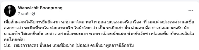 “คำตอบ คือ ข่าวปลอม นะครับ ฝั่งมาเลเซีย ไม่เคยยืนยัน จบข่าว อย่าเชื่อเขมรมาก พวกเราต้องหนักแน่น ช่วยกันจัดข่าวปลอมที่มาบั่นทอนจิตใจคนไทยครับ”