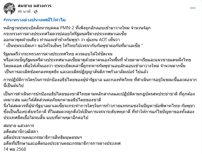 14 พฤศจิกายน 2568 นายสมชาย แสวงการ อดีตสมาชิกวุฒิสภา (อดีต สว.) อดีตประธานคณะกรรมาธิการสิทธิมนุษยชนฯ อดีตที่ปรึกษาแลและอดีตรองประธานคณะกรรมาธิการการต่างประเทศ โพสต์ข้อความผ่านเฟซบุ๊ก ระบุว่า...