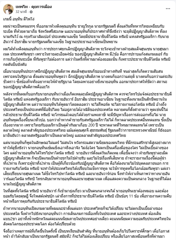 ในที่สุดทั้งโดนัล ทรัมป์ นายอันวาร์ ก็เข้ามายุ่งเกี่ยว มาเป็นคนกลางจนได้ นายอนุทินเขาต้องหมอบ และต้องยอมรับโดยดุษฎี จึงโพสต์เฟซบุ๊ก เล่าถึงการที่ประธานาธิบดีโดนัล ทรัมป์ เป็นข้อๆ 11 ข้อ เพื่อรายงานความคืบหน้าหรือการคุยกันกับประธานาธิบดีโดนัล ทรัมป์