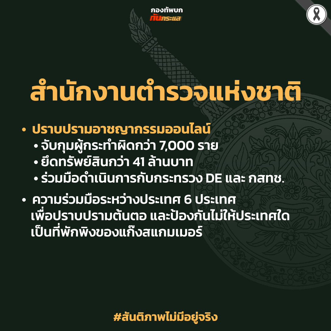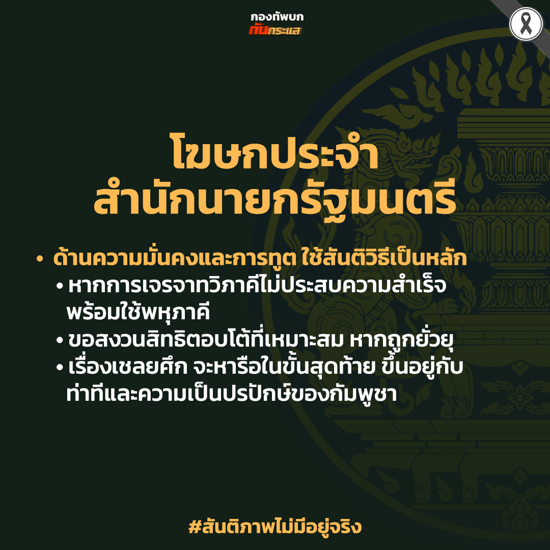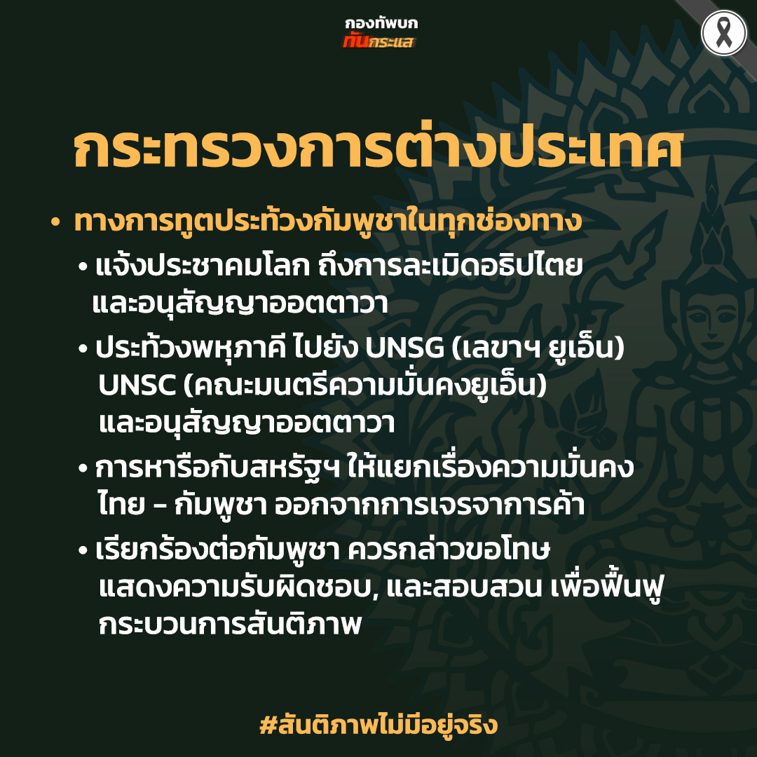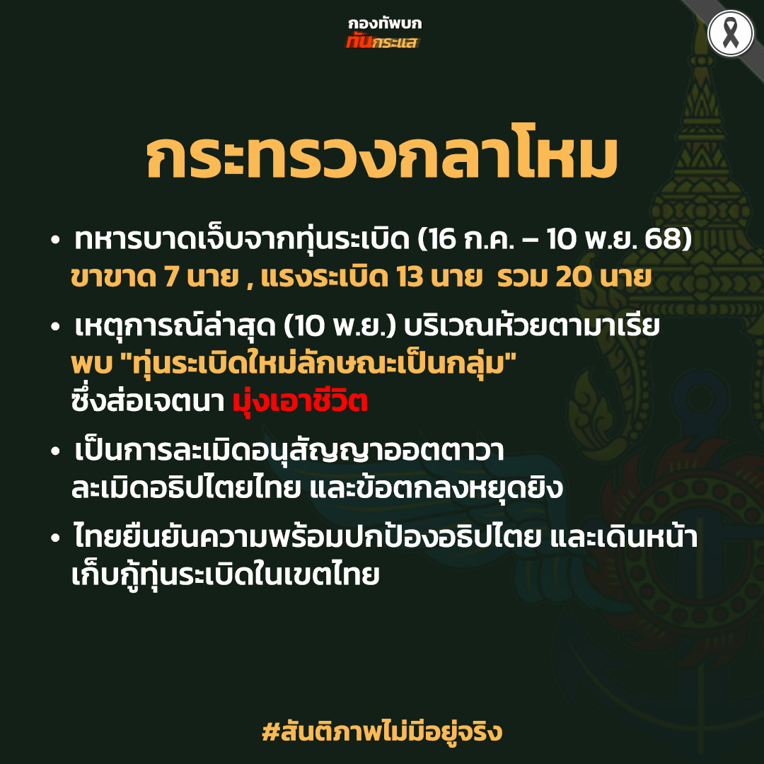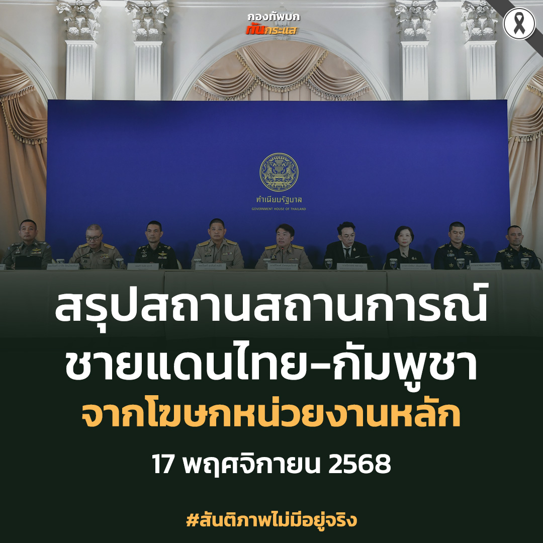 เมื่อวันที่ 17 พ.ย.2568 เพจเฟซบุ๊ก "กองทัพบก ทันกระแส" ได้โพสต์ภาพข้อความสรุปสถานการณ์ชายแดนไทย-กัมพูชา จากหน่วยงานหลัก ดังนี้ ...